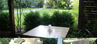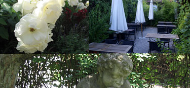 Mit viel Arbeit und Engagement entstand in den letzten Jahren eine kleine Oase. Gekonnt eingesetzte, unterschiedlichste Bepflanzung mit Farnen, Funkien, Hortensien, Oleandern und vielem mehr, Einfasssungen mit Buchs, Kirschlorbeer und verschiedenen hohen Heckenpflanzen schaffen Gartenräume, in denen sich die Gäste des Hauses zum Essen und Trinken einfinden, oder einfach nur einen lauen Sommerabend bei einem guten Glas Wein genießen können. |